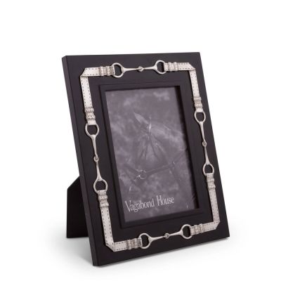 Frame your favorite Equestrian in our luxurious black wood photo frame embellished with pewter egg butt snaffle bits joined by detailed leather bridle straps in a repeating pattern. The versatile backing allows photo to free stand or be hung in a wall gallery.
