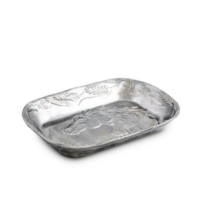 Two horses sniff out their next meal as a stalk of wheat joins them in the center of this dish. Countless other stems of wheat line the sides of this handmade, aluminum piece, their flowing pattern mirrored in the movement of the horses' manes.