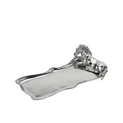 Take a break and enjoy the company of Arthur Court's Horse Figural Oblong Tray. A stallion rests on one side of this piece as its flaming hair radiates a powerful energy across the dish. The rippled design of this handmade, aluminum tray mixes well with the muscular lines in the horse's body.