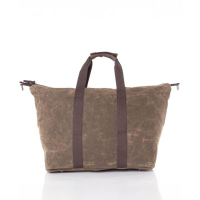 Pack your essentials for an overnight trip inside this rustic yet sophisticated Waxed Canvas Voyager Weekender. This large weekender style duffel bag is made from waxed canvas and features contrasting deep brown accents and trim, heavy duty webbing, two top handles, an adjustable detachable shoulder strap, and bottom antique brass stud feet. It includes a top zip closure and a fully lined interior.