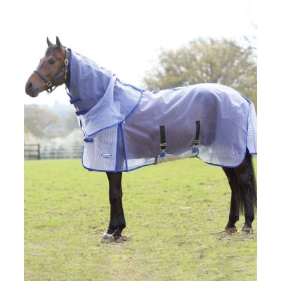 Durable fine mesh with 1200 denier polyester cross hatch weave to help control and limit tears. Removable neck cover and belly wrap offer great versatility. Traditional side gusset for natural movement. Full wrap tail flap for extra protection. Adjustable twin chest buckles and elasticized, adjustable and removable web leg straps.