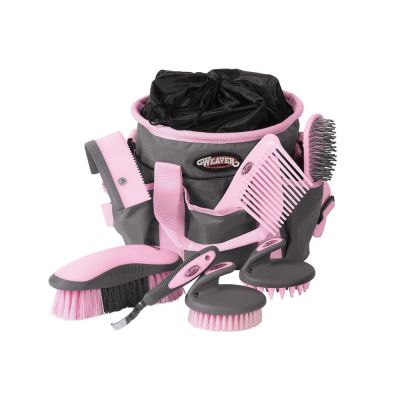 Perfect for any beginner, this 7-piece assortment features a great selection of grooming essentials in a durable nylon tote bag for easy organization and carrying. The handy tote bag features six exterior pockets for added storage, a wire-reinforced top for stability, a convenient top drawstring closure, plastic feet that protect bottom of bag, a flexible retaining strap, comfortable webbing handles and an adjustable, padded shoulder strap attached with snaps for easy on and off. Includes a comb, hoof pick, palm held curry comb, palm held face brush, mane and tail brush, dandy brush and sweat scraper/coarse curry combo.