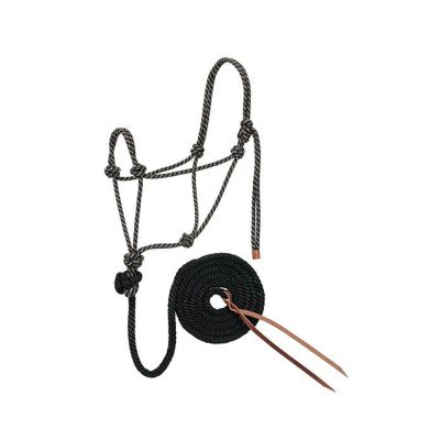 A great halter at a great price! This halter is made from a continuous piece of 3/8" poly rope with a hand-knotted construction and a double noseband and crown strap. Hollow braid spun 1/2" x 10 poly lead.