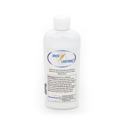 Activate Liquid formula by mixing with equal amounts of white vinegar in a non-metal container; stays active for up to 8 hours. For hoof soak, combine 2 oz White Lightning, 2 oz white vinegar and enough water to cover half way up the hoof capsule. Insert hoof in Disposable Soak Bag (sold separately) or heavy plastic bag to contain the chlorine dioxide gas and secure top to prevent leakage. For best results, keep hoof contained for 40-45 minutes. Repeat 2-3 times per week for 4-6 weeks, then 1-2 times weekly until hoof has grown out completely. Use once a month thereafter to help keep white line disease away. Important notes: do not mix more than you're going to use at one time. Best if used on unshod animals on soft ground and protected from pawing. Protect from freezing.
