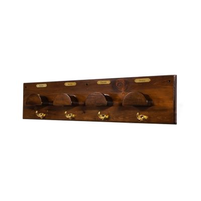 hese stylish racks keep bridles and halters neatly in place. Each half moon holder is 4'' long with a 1/2" cap to prevent slipping. A solid brass strap hook is under each half moon. Beveled edge matches other wall hung products. Made in the USA.